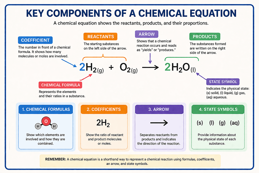 To represent these reactions on paper, we use chemical equations. There are some main components shown in the image below