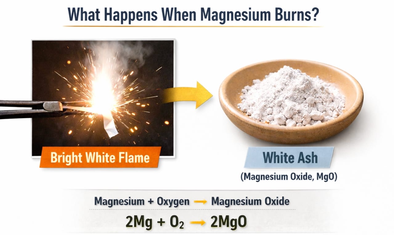 Magnesium Ribbon Example: When you burn a magnesium ribbon in air, it reacts with oxygen to form a white powder called Magnesium Oxide (MgO).
